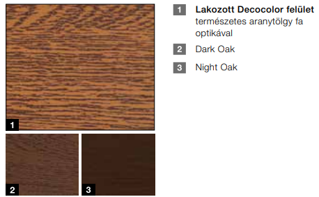 Fehér szín RAL 9016 woodgrain felülettel, illetve DarkOAK szín decocolor felülettel választható.